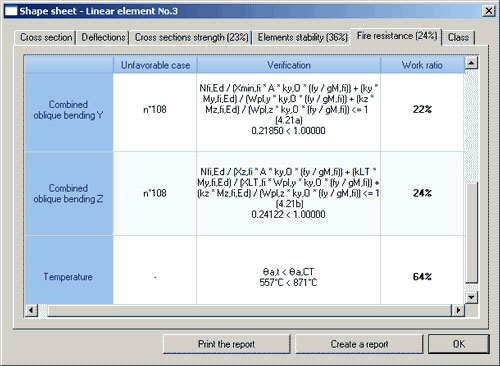 The shape sheets command allows you to view all the available results for a selected steel element: cross section properties, deflections, strength, stability, fire resistance and cross section class according to Eurocodes 3 in one dialog box.