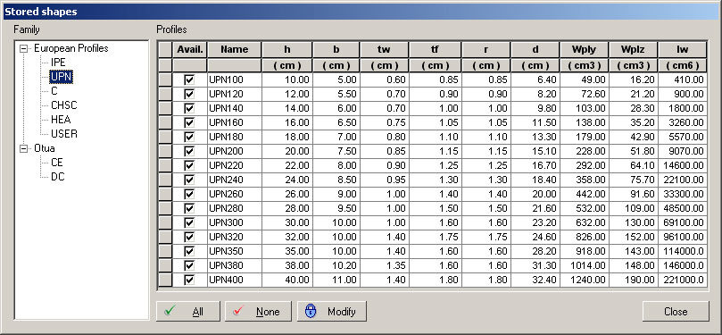 The Stored shapes command allows you to configure the list of available shapes from which the steel expert may choose the optimal ones.