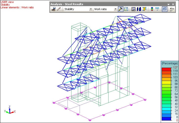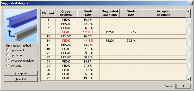 The steel expert compares the work ratio of the steel elements and suggests (if necessary) more adequate cross sections, that would correspond to the defined conditions.
