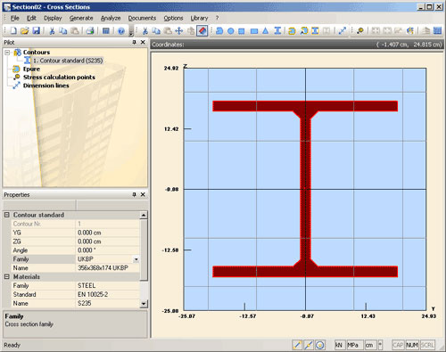 For advanced editing, visualization and calculation of geometrical characteristics of any type of cross section, Advance Design provides a specialized module: Cross Sections. This module can base the calculation (including torsionnal inertias and shear reduced sections) either on analytical formulas or on finite element analysis depending on the complexity of the cross section.