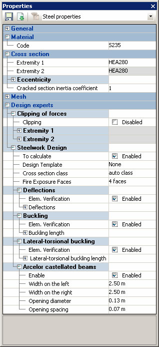 The properties list for steel elements includes all the required parameters for deflection, buckling and lateral-torsional buckling verification. Castellated beams can be defined and designed with the ACB+ module (Arcelor Cellular Beams).