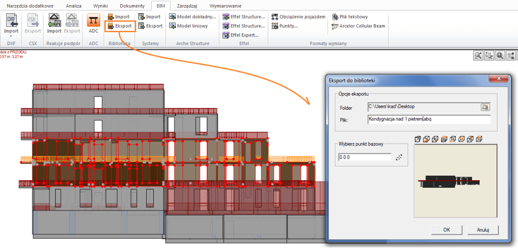 We will use a library export to extract a single storeys or slabs for a detailed analysis. I select necessary objects – in this case a whole story with loads and upper elements and I choose a saving path. I can also pick a reference point which will allow me to precisely join models if needed. If a reference and insertion point is the same, the position of a structure won’t change in the global cooridinate system.