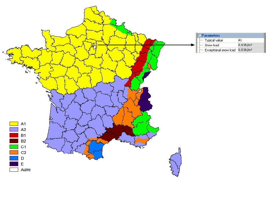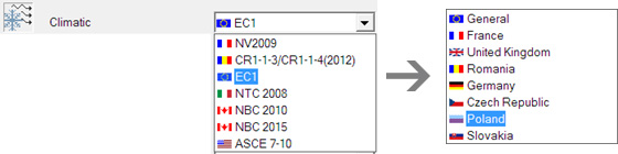 Advance Design provides several climatic standards such as NV 2009 (France), NP082-04 / CR1-1-3-2005 (Romania), Eurocode 1, Canadian (NBC2010 or 2015) and US (ASCE 7-10) codes, with different national appendixes: