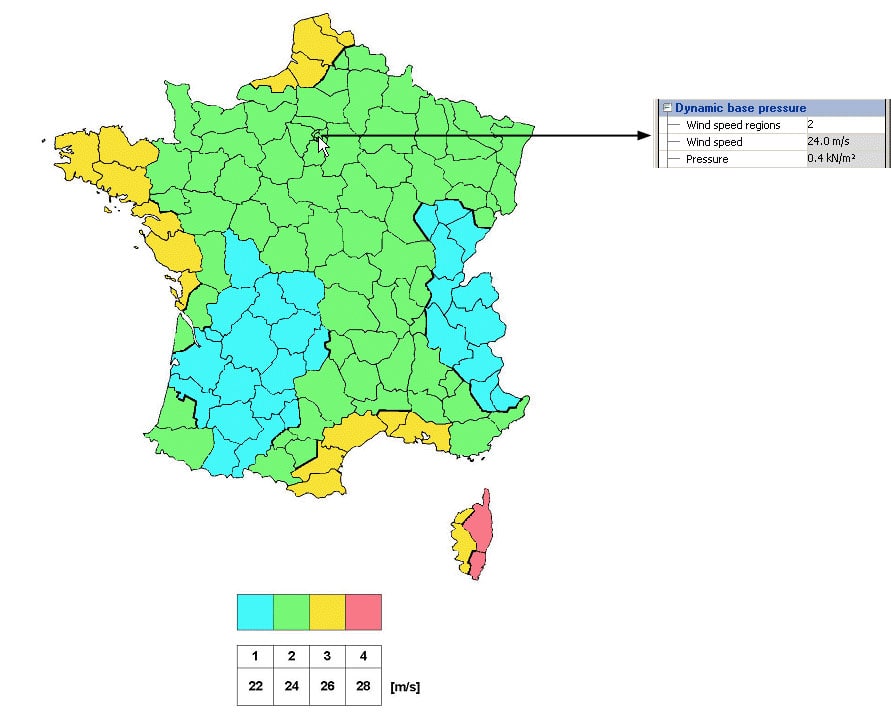 With a single click, the values of the wind speed, wind pressure, snow load and exceptional snow loads on the structure faces and roof are automatically defined according to the selected region: