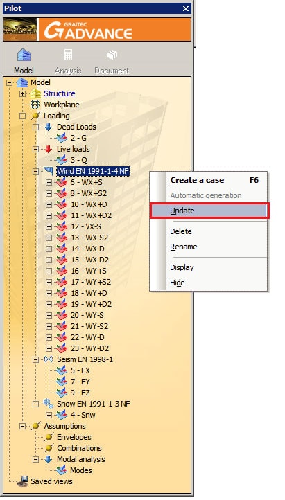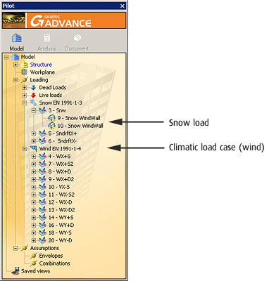 The climatic load cases and loads are automatically displayed in the graphic area and also, in the Pilot, in the corresponding loads family, providing access to an efficient management: