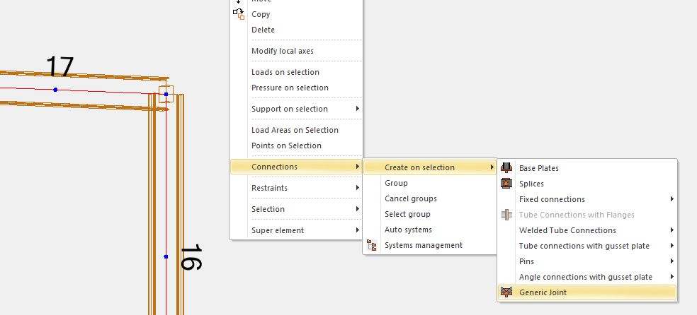 To facilitate and speed up the definition of generic joints for steel elements, the command to create them based on the current selection of steel elements has been added. A new command is available on the right-click menu and creates a single connection for steel elements that are in contact at the same point.