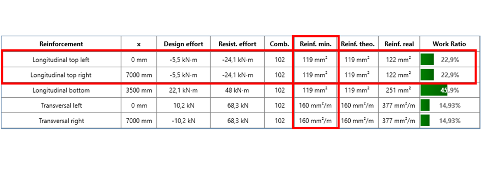 The info panel content for the RC modules has been supplemented with additional types of results, including: minimal reinforcement areas for beams, more details for top longitudinal reinforcement on beams, buckling information for columns and punching verification for foundations.