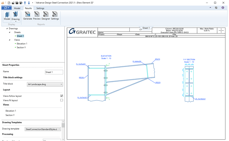 - Interactive drawings for steel connections easy and full control over the content of the drawing thanks to the ability to freely compose drawings, easy modification of the location of drawing components, and scale for views.