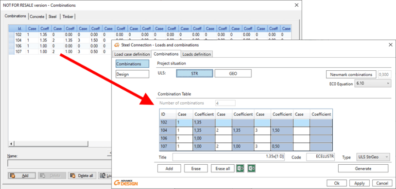 To improve the transfer of load-related information when transferring data from the Advance Design model to the design modules, new options have been added to easily transfer the list of self-created or modified definitions of load combinations to design modules.