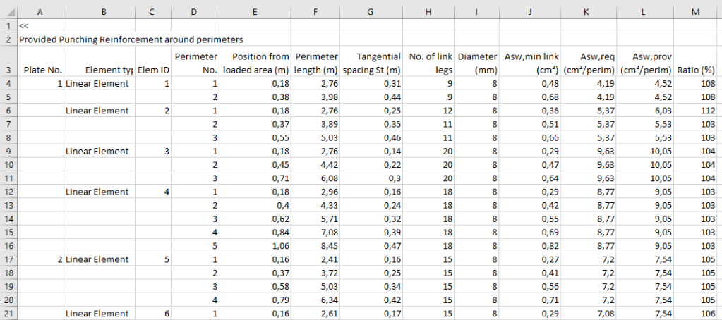 Figure 3 – Provided punching reinforcement table exported to Excel