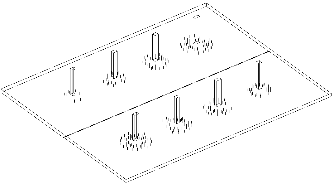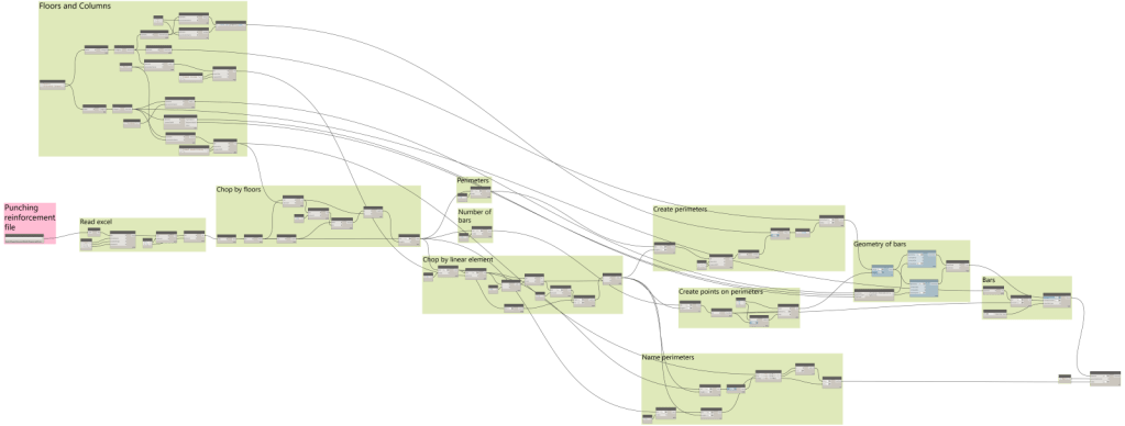 The Dynamo script needs only one input – Excel file. It extracts data from the spreadsheet and then groups the read data relative to plates and columns. Then the existing floors and structural columns in Revit model are found using the numbers stored in the ‘mark’ parameter, which was completed during model synchronization with Advance Design. Then other required information is collected from the Revit model, such as floor thickness, reinforcement cover or column geometry parameters. In the next step vertical bars of the shear punching reinforcement are generated, and thanks to the fact that they are grouped into perimeters, bars can be inserted as one set in Revit.