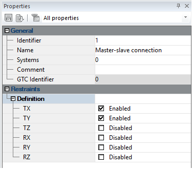 The following properties regarding restraints definition are defined for the “DOF constraint” (Master-Slave connection):