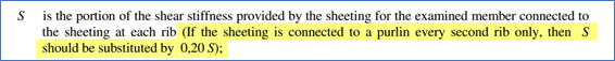In case the purlin is not connected at each rib but at every other rib, only a small portion (20%) of this S stiffness can be considered :