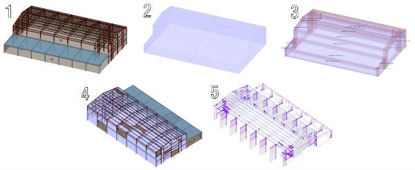 Above is a general diagram of how a climate load generator works (using wind as an example). Step 1 is practically just the preparation of the FE model for any subsequent analysis. However, it is important that the whole object is clad with cladding, i.e. panels, which do not have any mechanical properties but are only supposed to distribute the surface load on the structural elements. Their geometry is presented in step 2 – on this basis the program recognises the shape of the object and applies appropriate load schemes. Step 3 is the determination of the external pressure zones and the load values which are distributed from the cladding to the members and shells in step 4. In step 5 the final result, the wind load on the structure, is presented.