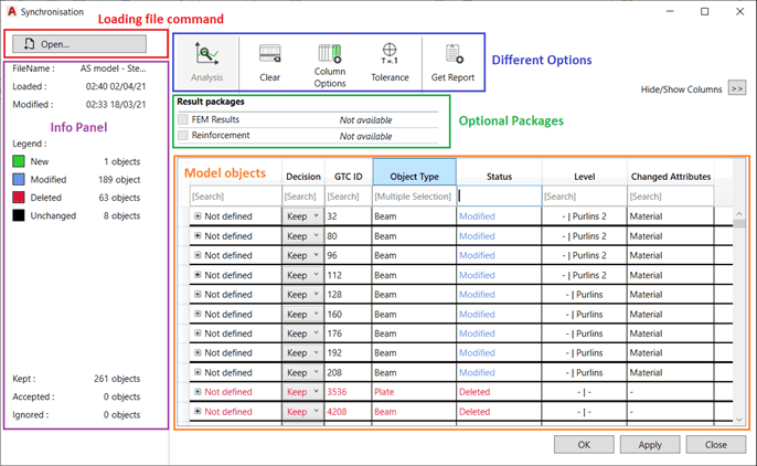 Within the file and the options available we have the ability to have a dedicated object ID, object type, Status display for New/Modified/Deleted, Material, Geometry, Element Type.