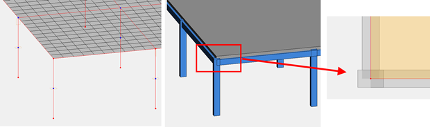 Let us now consider a different case – the position of the support elements in the FEM model is different from the real one. To illustrate this we will use the same corner from the model shown above. Let us therefore assume that in reality the column is aligned with the correctly modelled beams.