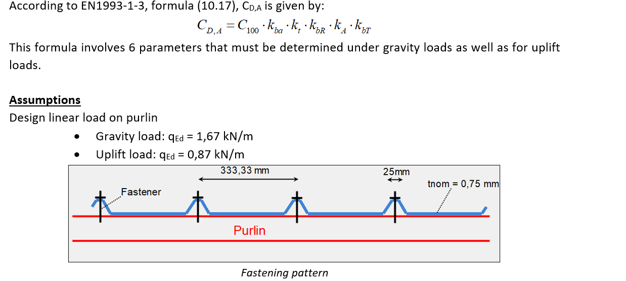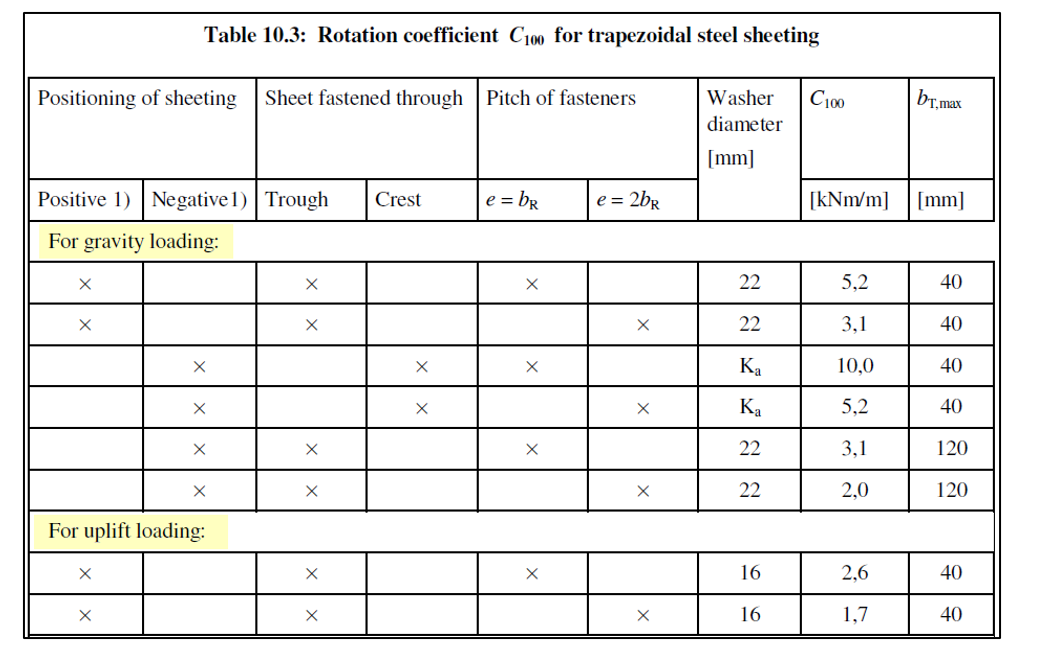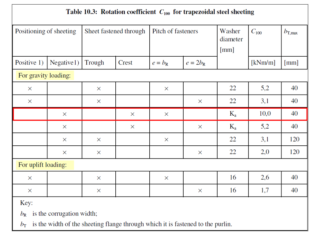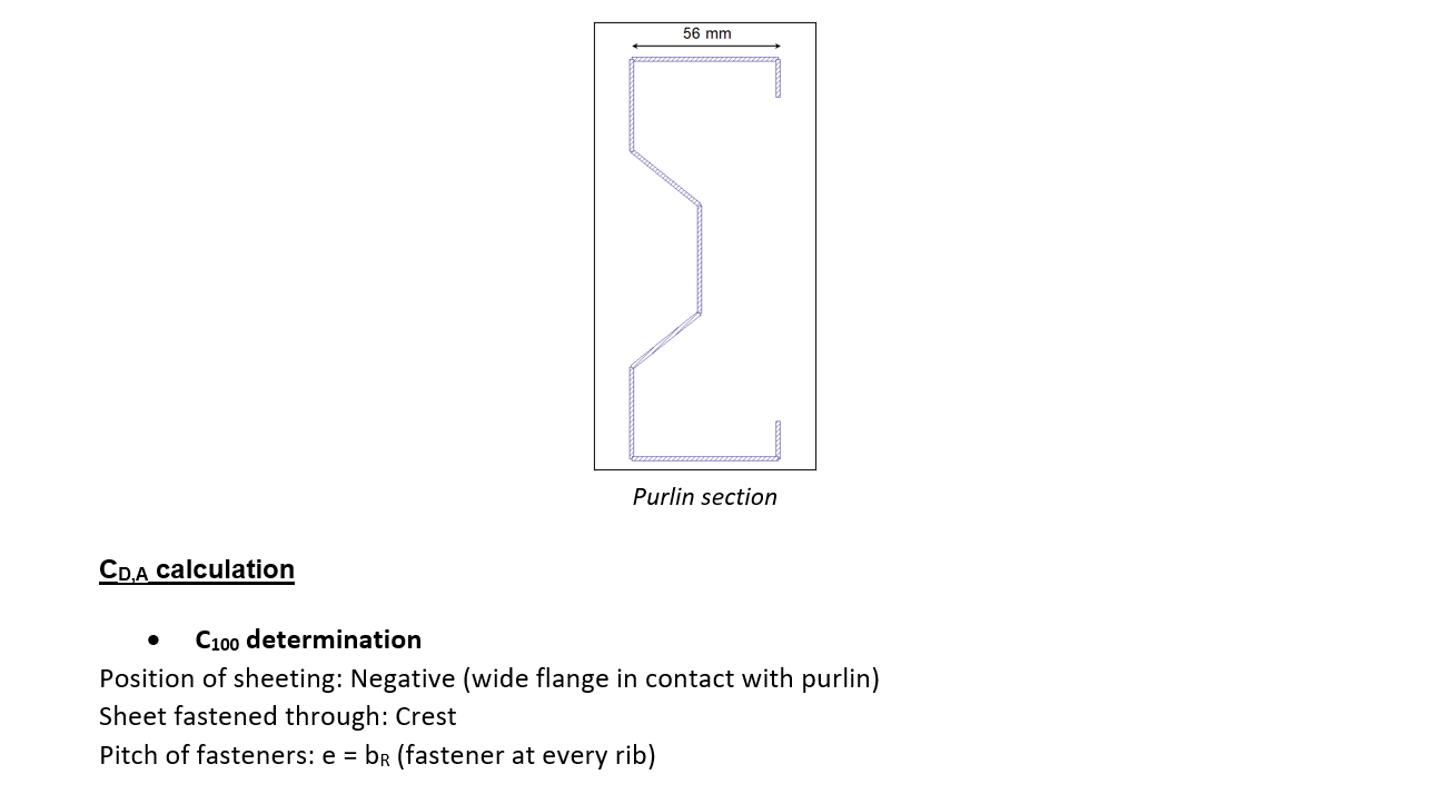 The following example shows how to estimate the rotational stiffness of a trapezoidal sheeting connected to the top flange of a purlin (CD,A) as per EN1993-1-3.