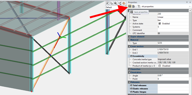 If in the next project some of the elements should be modeled and parameterized in a similar or identical way, we can create our own library easily. To do so, simply select an element (e.g. bracing) and use the ‘Save properties’ command located at the top of the properties window (Figure 1).