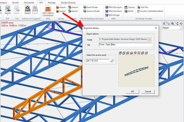 In this way, we can create a library of typical structural parts (for example, girders, frames, trusses, bracing systems) and, together with the geometry, all the properties of the elements are preserved, including the design parameters. But this mechanism is more universal and allows you to write any object, for example a layout of selected loads, into the library. This functionality is also useful when one or more users separately model different parts of a structure. Then the element libraries export / import tool makes it possible to assembly these parts into one single project.