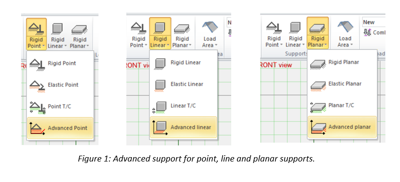 Advance Design has all these special supports available in the advanced supports feature. They can be assigned to each DOF separately and are available for point, line and surface supports (refer to Figures 1 and 2)
