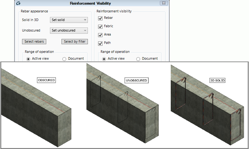 Rebar Visibility, used for changing the view’s visibility state, so as to show rebar unobscured and/or as solids in 3D views, or for hiding certain elements;