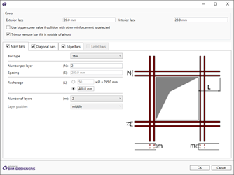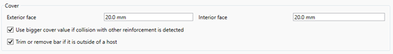 The Cover section allows the manual control of the cover, the automatic cutting of bars in case of holes close to the edge and the option to automatically adjust the cover to the existing reinforcement, to keep the correct 3D arrangement of bars.