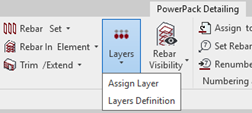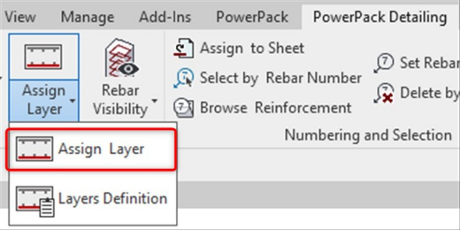 The manual assignment is done for selected reinforcement using the Assign Layers command, which is available in the PowerPack Detailing ribbon.