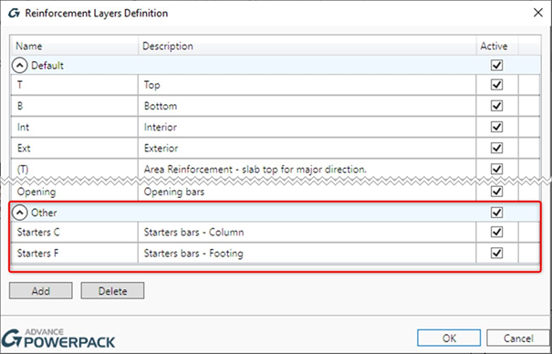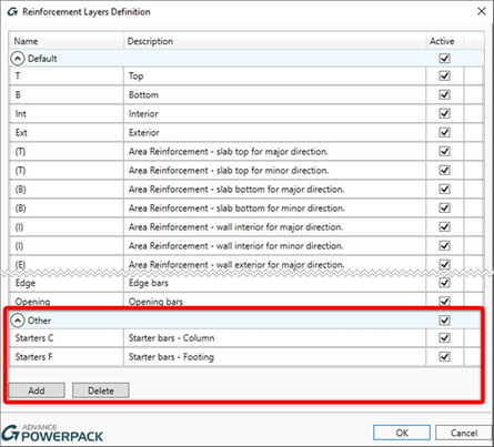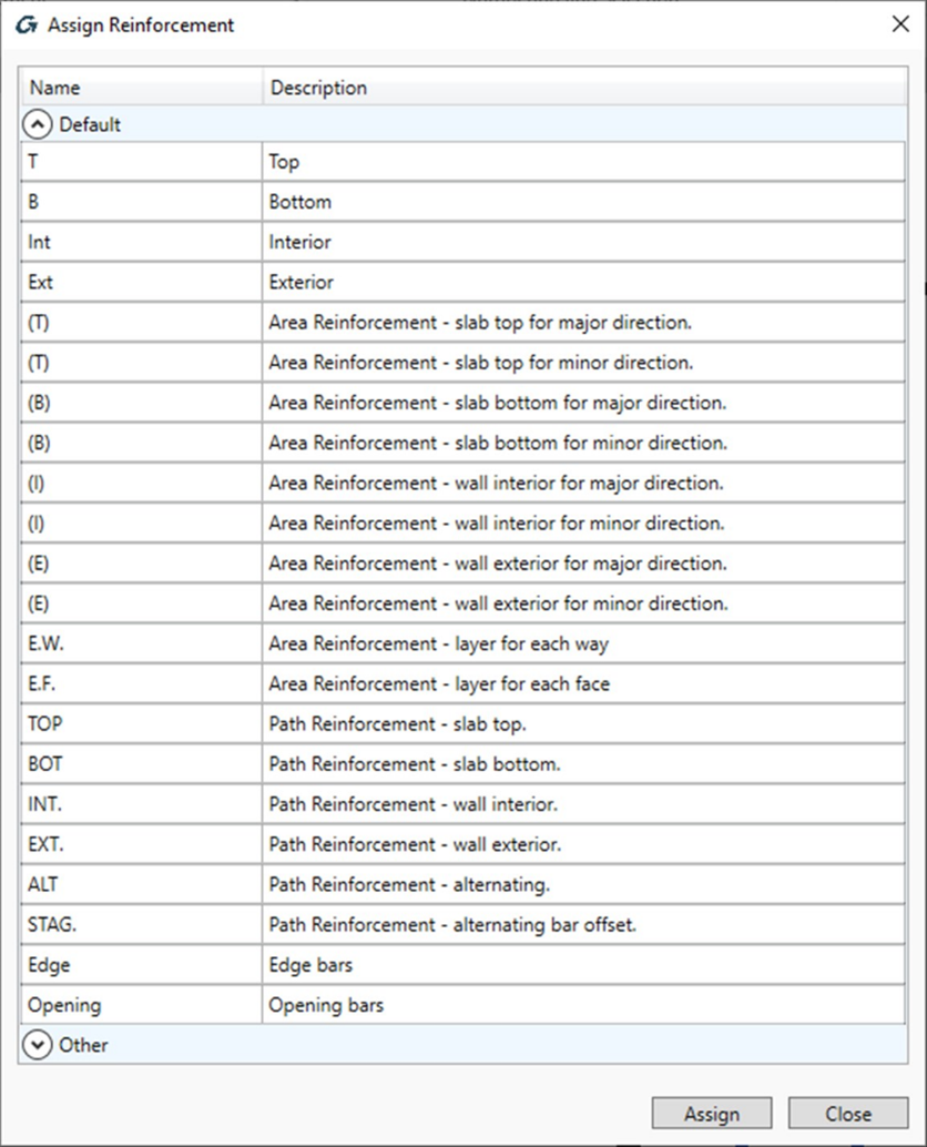 The content of the list is based on the configuration from the Reinforcement Layers Definition window, opened by the Layers Definition command. The user can modify names for default layers, use the Active option to limit the list of layers that can be available during the assignment and add new positions/layers to the Other group.