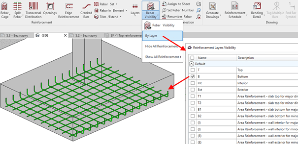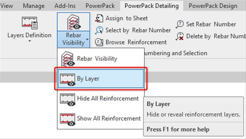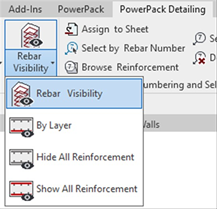 In addition, three commands are available under the drop-down list under the Rebar Visibility: By layer, Hide All Reinforcement and Show All reinforcement.