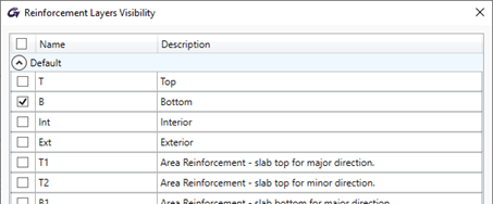 When the Top or Bottom option is selected, then an additional filtering for reinforcement is activated, respectively by the top and interior or the bottom and exterior layers. When the Selected option is active then the selection of layers for displaying is done through the dialog opened by the Select Layers button .