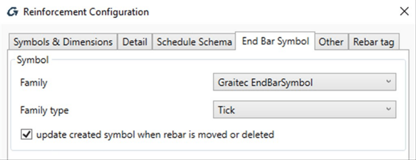 The type of bar end symbol depends on the family used (Detail items category). The default family and type are selected in the Reinforcement Configuration window.